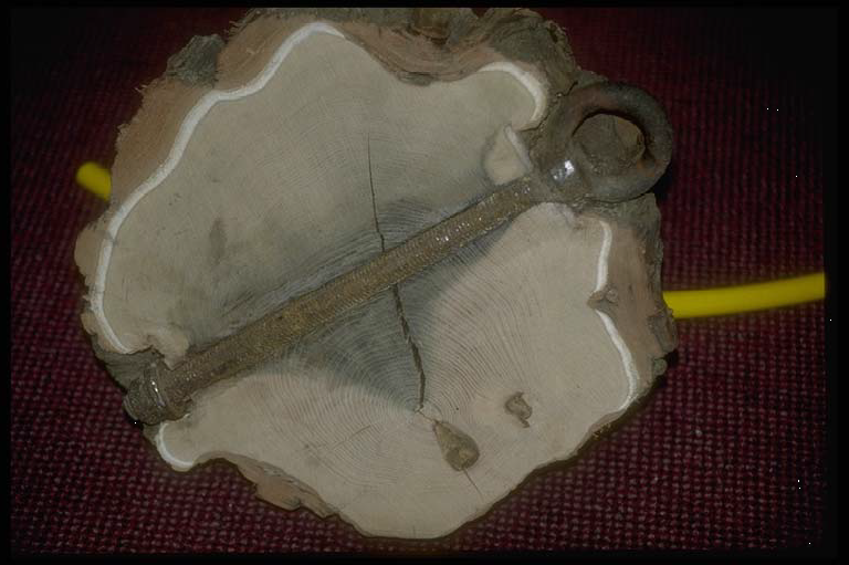 This picture shows how trees react to cabling and bracing hardware. Over time trees develop new tissue and bark that encompass the hardware. The new wood provides a stronger anchor point and it improves the overall strength of the support system